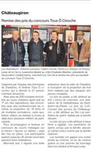 Retour en photos sur le Festival Tous Ô Cinoche Toutes2013201420152016201720182019202020222023 Affiche 2013 Atelier copains copines Pierre-luc granjon à la mediatheque Pierre-luc granjon au cinema Pierre-Luc Granjon et Fabien Drouet Affiche 2014 Agnes Lecreux et Fabien Drouet Agnes Lecreux Luc boileau Marc Boreal Affiche 2015 Dimitri Ahmed Dramé Agnes Lecreux Affiche 2016 Antoine Lanciaux Concours Equipe du festival Marie Bureau - presse Pierre-Luc Granjon et Antoine Lanciaux Affiche 2017 Atelier Arnaud Leray Atelier Colorant14 Atelier Fabien Drouet Le cinoche Fabien Drouet Lola Doillon en classe Lola Doillon - presse Lola Doillon Nicolas liguori Samuel Guenole et Nicolas Liguori Samuel Guenole Affiche 2018 Le cinoche Edouard Pons Jean-Pierre Le Mouland Marie Bureau Doublage Affiche 2019 Agnes Lecreux Anita Doron - presse Anita Doron Atelier Marie Bureau Emmanuel Gorgiard et Yves Cotten - presse Emmanuel Gorgiard et Yves Cotten Marie Bureau et Anita Doron Quatuor à cornes Yves Cotten Affiche 2020 Arnaud Demuynck Baby cinoche Cine Concert 2 Cine concert 3 Cine concert Claire Paoletti Equipe cinoche Fabien Drouet Gilles De Maistre Jean-Claude Rozec Marc Blanchard Fleurs utopiques Marie Bureau Zebulon Marie Bureau Marc Blanchard Marc Blanchard planetes - 2 Marc Blanchard planetes - 1 Fabien Drouet Equipe cinoche Cine-concert Colorant14